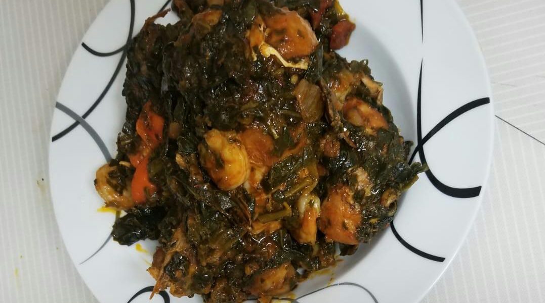- Ajouter y les épinards découpés, réduire le feu et faire cuire pendant 5 minutes, puis ajouter l’huile de palme, le piment vert couvrir et laisser cuire pendant 5 autres minutes sur feu doux.
