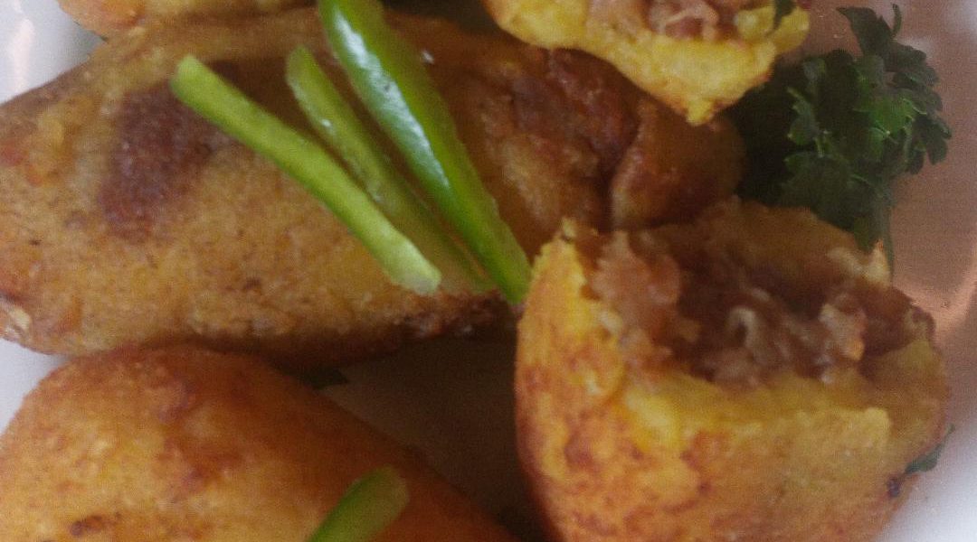- Écraser la pomme de terre en y ajoutant un peu de sel, former avec la pâte obtenue des boulettes en y introduisant d la viande hachée déjà cuite et assaisonnée.